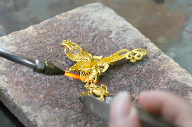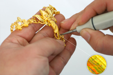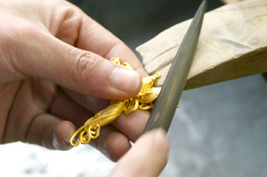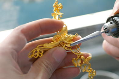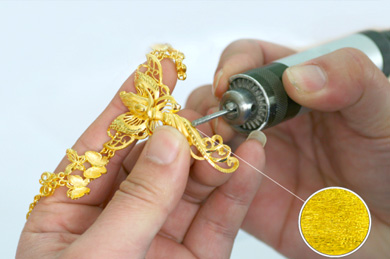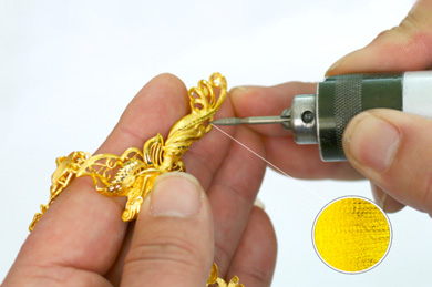 這樣一件黃金產品的基本形體就完成了,下一步開始對黃金產品的細節部分進行精心的刻畫,稱之為表面處理。