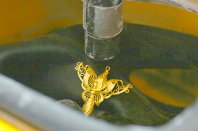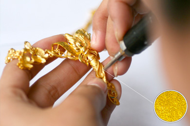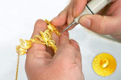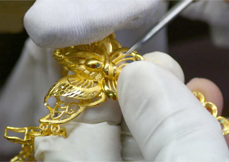 將澆鑄出來的產品進行修整稱之為執模。執模包括整形、修挫、過砂、焊接、組裝等,全部用手工方式進行。執模就是將澆鑄出來的黃金產品修整到和原版一樣,需要技能 水平較高的工人用嫻熟的手法制作。